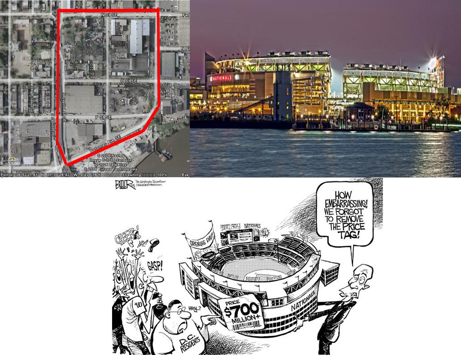 Gentrification via sports collage, December 22, 2012. [Includes aerial view of location of new DC baseball stadium site, June 22, 2006, http://www.wreckingcorp.com; Nationals Park Greeting Card; Baseball Stadium Price Tag cartoon, March 27, 2008 (Nate Beeler/Washington Examiner)]