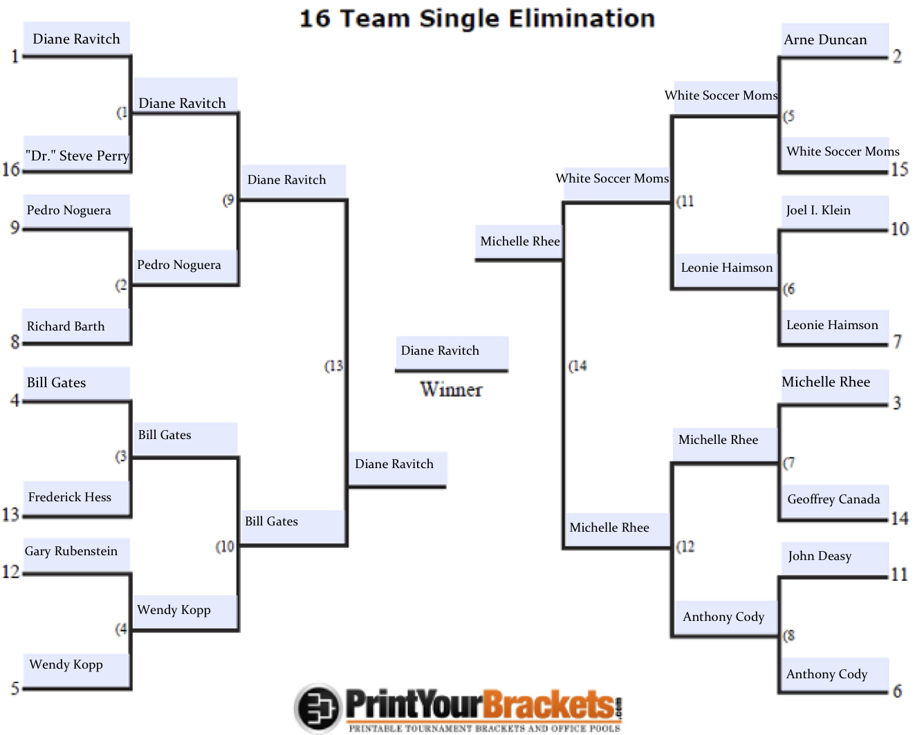 Okay, I’m being tongue-in-cheek. Yet there’s a part of me — the same part that wrote Celebrity Deathmatch Meets Brave New Media back in ’10 about watching politicians and journalists beat on each other — that could imagine some of these fights play out in a boxing ring. To have Bill Gates get his head knocked in by Anthony Cody. Or Leonie Haimson lay out former New York City DOE Chancellor Joel I. Klein. Or, for that matter, the White soccer moms US Secretary of Education Arne Duncan made fun of giving him a full-on beatdown. Then, after the ten-second countdown, they stitch and bandage him up, and begin again.