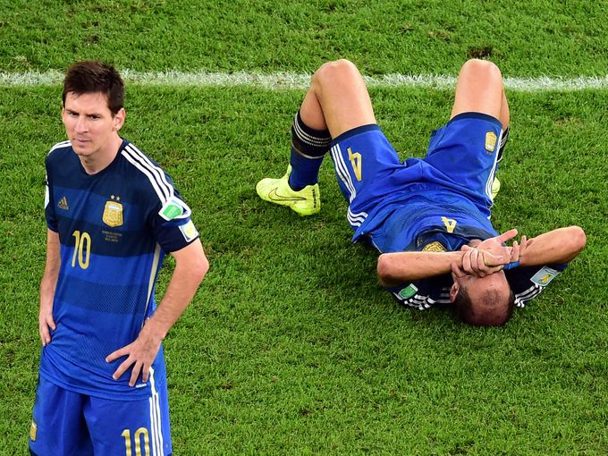 Argentina's Pablo Zabaleta lies on the pitch as Lionel Messi stands beside him after losing to Germany in the final, Rio de Janeiro, Brazil, July 13, 2014. (Francois Xavier Marit/AP via http://usatoday.com).