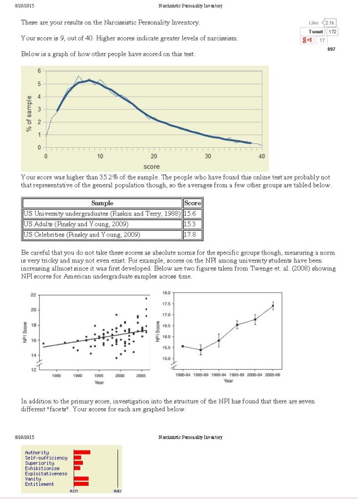 On My Own Narcissism 19 Saturday Mar 2016 Original size at 816 × 1138 ≈ Leave a comment My NPI Score, done August 20, 2015. (http://personality-testing.info/tests/NPI.php).