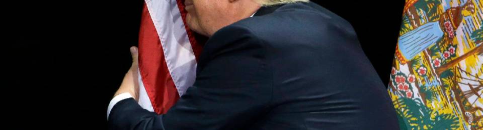 Then candidate 45 hugging US flag at campaign rally (remember, he’s the anti-Midas, everything he touches turns to crap), Tampa, FL, June 11, 2016. (Chris O’Meara/AP, Times Free Press).