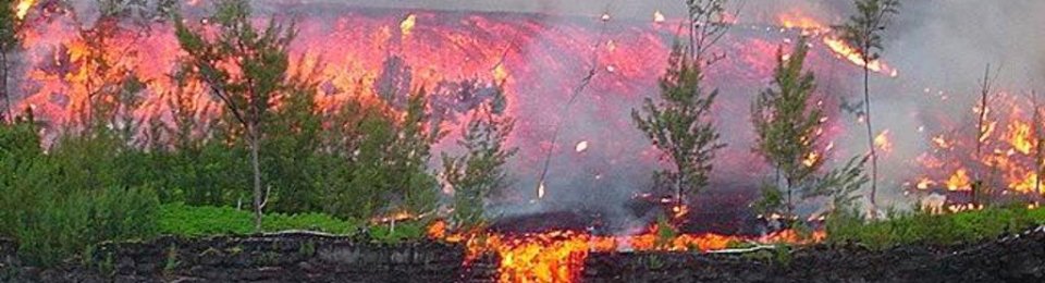 Réunion Island’s (French department, off Madagascar) Piton de la Fournaise, lava flow, February 26, 2005. (Samuel A. Hoarau via Wikipedia). Released to public domain via CC-SA-3.0.