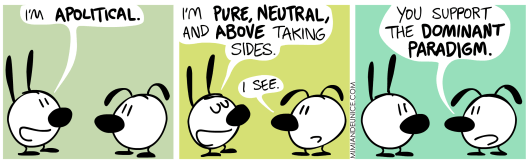 So no, you can’t away from politics in this world. One would have to take a time machine back to before the Agricultural Revolution to find humans in a world without politics. But even then, there would be domestic politics, gender politics, tribal politics, and food/water politics. Not to mention, religion and the politics thereof. But, keep believing that you’re apolitical, and see how that works out as your worldview comes crashing down.
