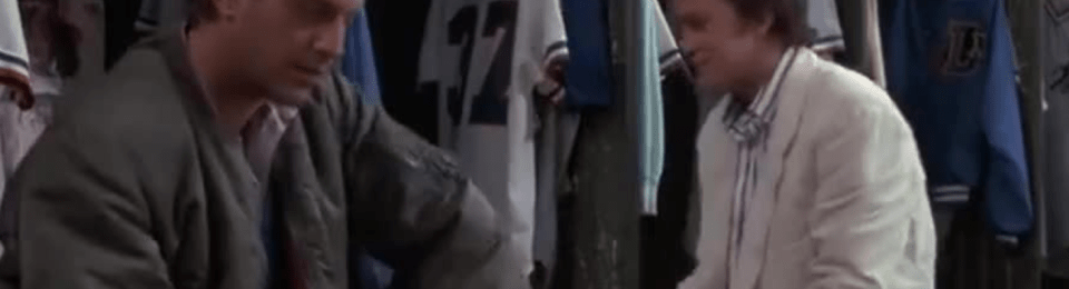 “No, fear and arrogance, you hayseed.” Kevin Costner and Tim Robbins characters in Bull Durham (1988), screenshot, May 18, 2019. (https://getyarn.io).