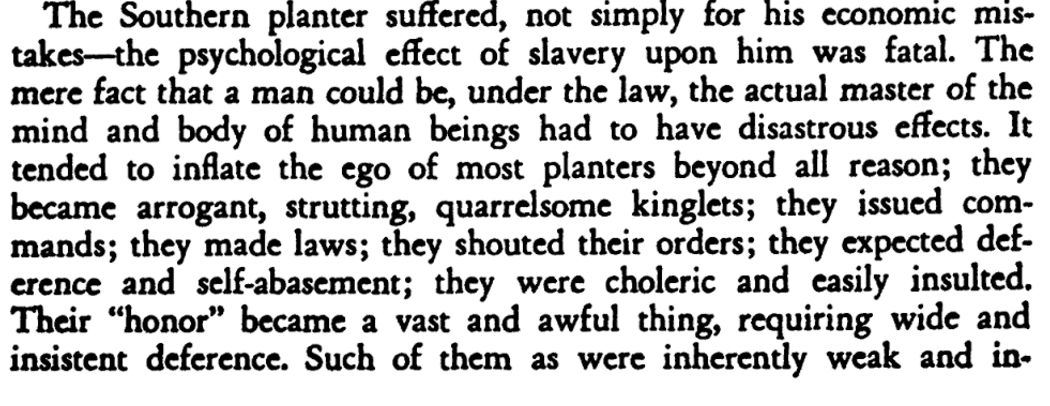 Ah, but the DSM-V is describing the behavior of individuals, and not that of a class of people or a society, like what Du Bois attempted to do in Black Reconstruction, right? Yes and no. Du Bois used one individual example after another to build the case that the “white laborer” had come to have the same aspirations for the “public and psychological wages” that the Southern planter class had obtained through generations of owning slaves. Only, Blacks by the time of Reconstruction were slaves no more. The best way for Southern White elites to provide poor Whites all of the amenities of American racism without the latter either revolting against them outright or joining up with Blacks to fight grinding poverty was to codify American racism in the form of Jim Crow.