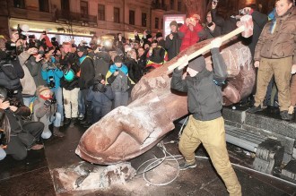 Toppling and destruction of Vladimir Lenin’s statue via sledge-hammer, Berdichev, Ukraine, February 22, 2014. (unknown).