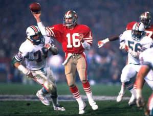 San Francisco 49er QB Joe Montana scrambling to make a throw, Super Bowl XIX, Stanford Stadium, Palo Alto, CA, January 20, 1985. (http://youtube.com).