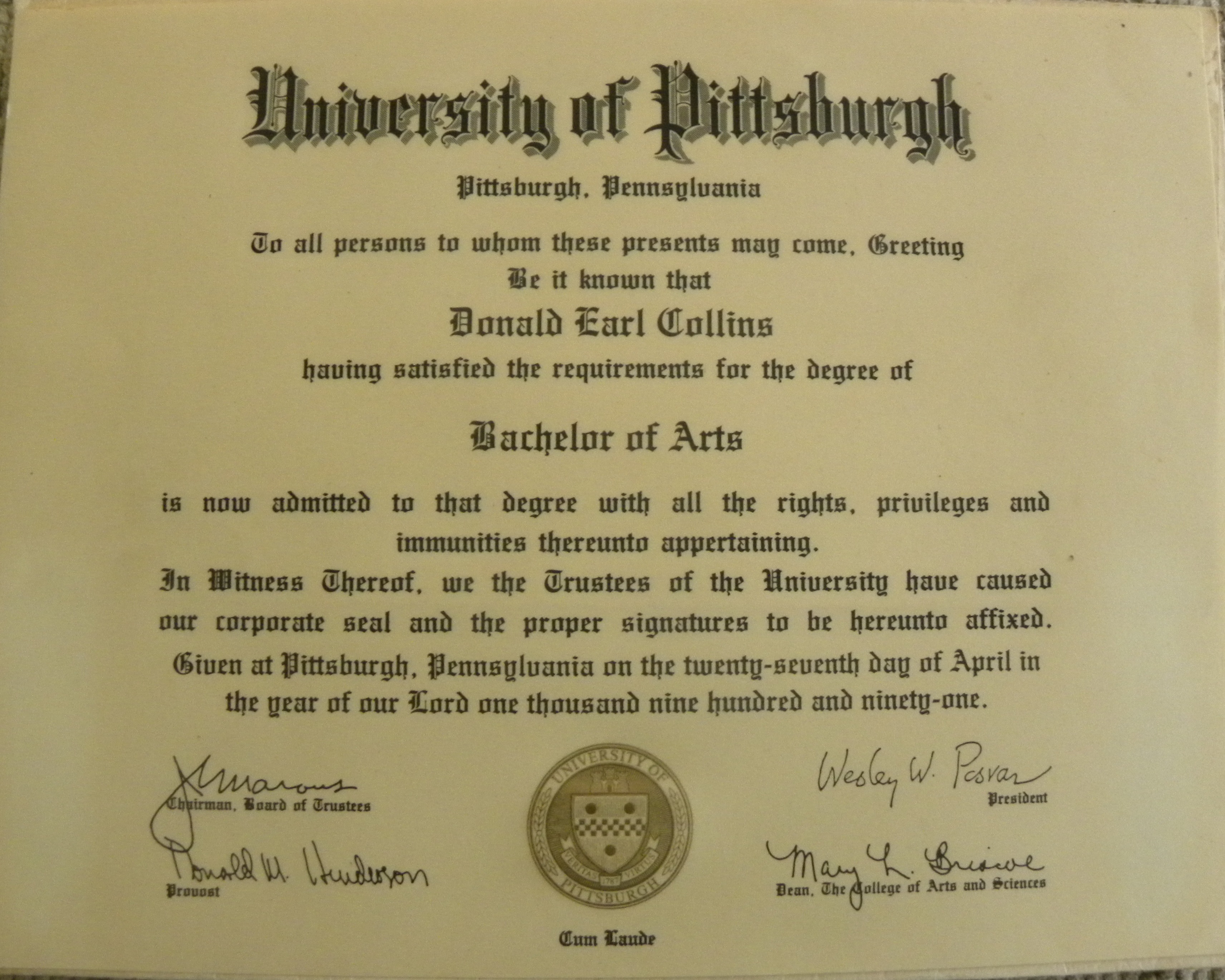 My B.A. degree, University of Pittsburgh, April 27, 2011. Note that this was Wesley Posvar's last graduation signature. The university president would retire the following month amid a $3 million golden parachute scandal.