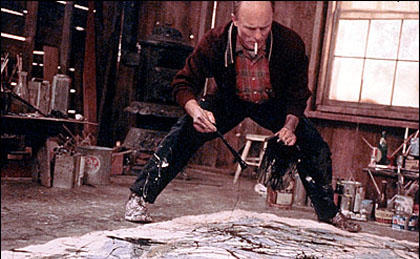 Ed Harris as Jackson Pollock in Pollock (2000), spreading and throwing paint, August 6, 2009. (http://www.totalfilm.com).