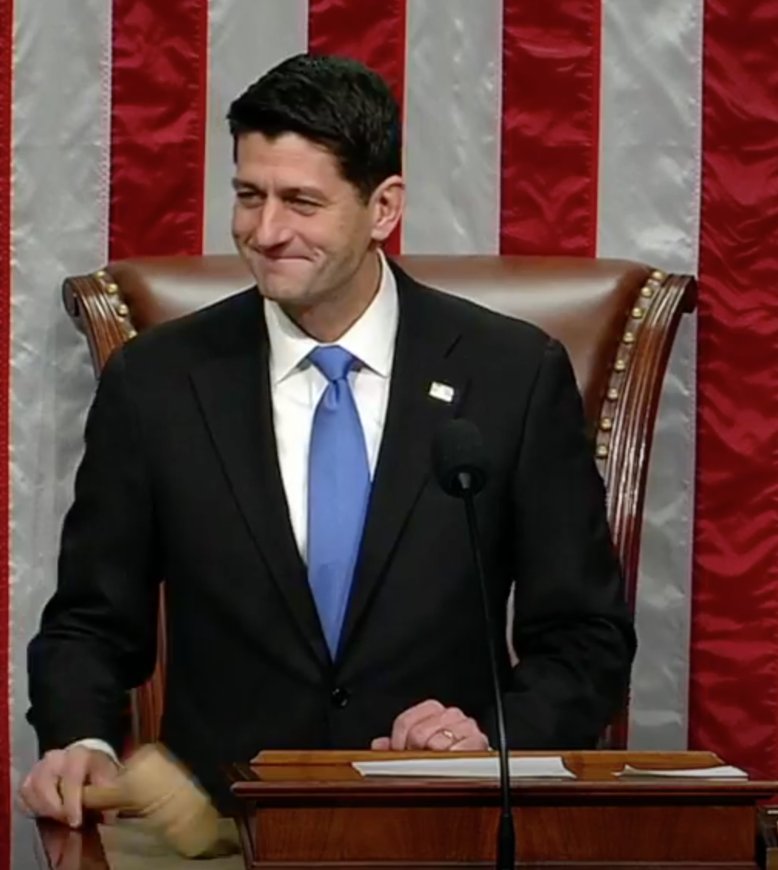 Rep. Paul Ryan (R-WI) gaveling in ecstacy as House passed its $1.45-trillion tax cut bill, December 19, 2017 (http://twitter.com).